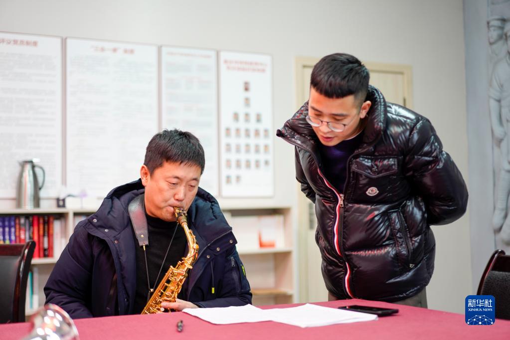 圖為在重慶市特殊教育中心,揚帆管樂團老師李忻念(右)和周建勛在辦公室研究國際殘奧委會會歌《未來贊美詩》的樂譜(1月12日攝)。