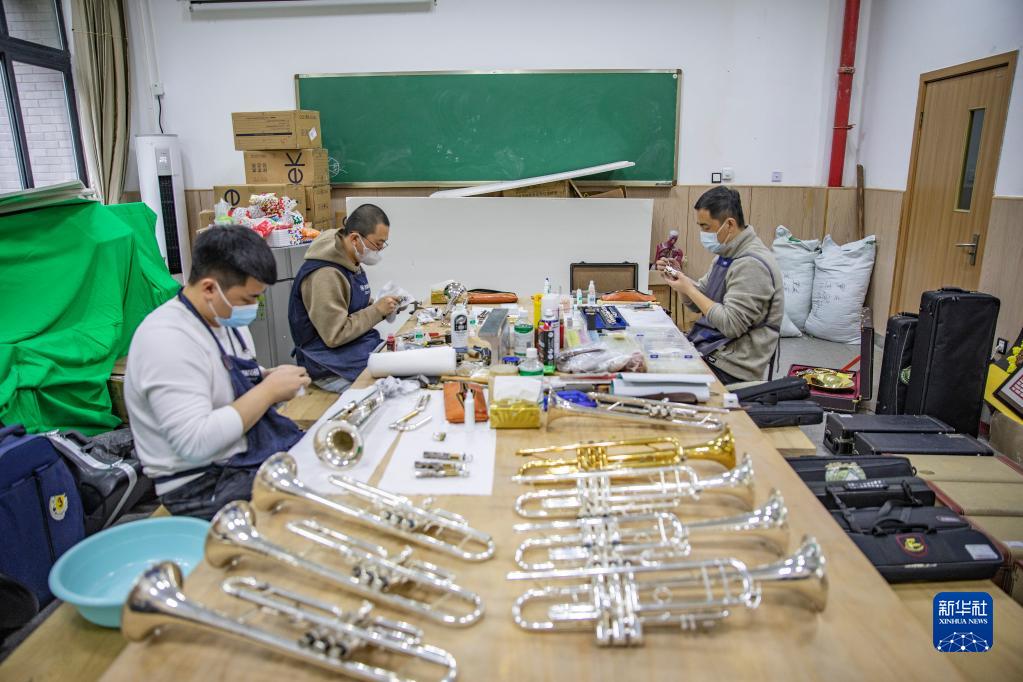 圖為在重慶市特殊教育中心的意見工作室內,學校組織器材養護人員對樂器進行集中維修保養(1月12日攝)。