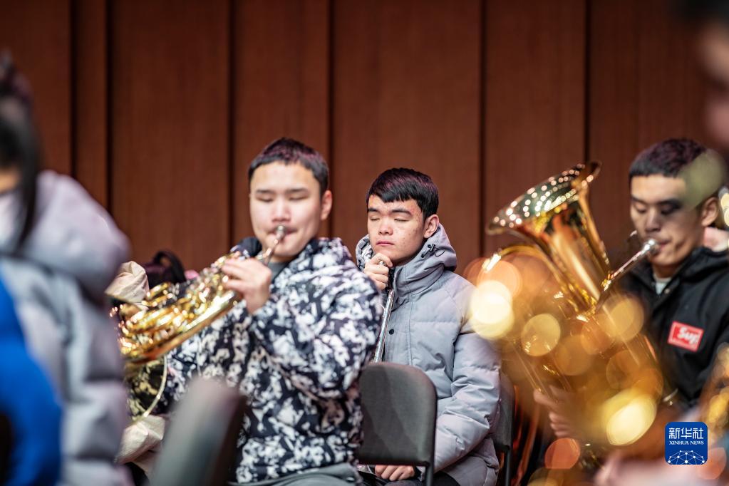 圖為在重慶市特殊教育中心揚帆音樂廳,揚帆管樂團小號手王太樊(中)和同學們在練習國際殘奧委會會歌《未來贊美詩》(1月24日攝)。