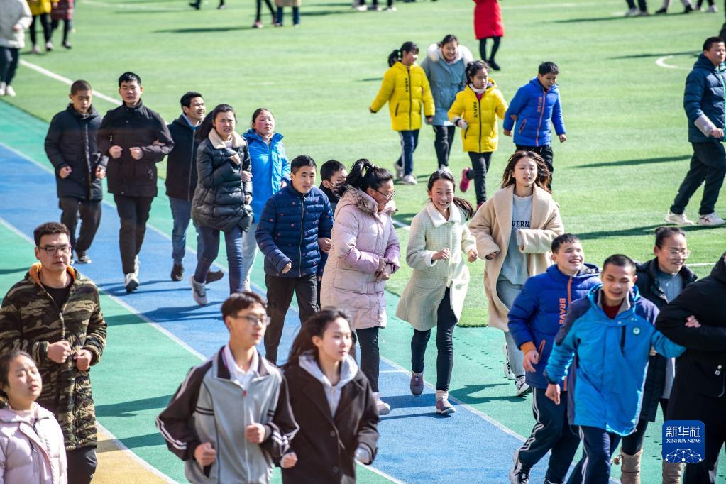 圖為重慶市特殊教育中心視障學生在學校操場跑步(2月23日攝)。