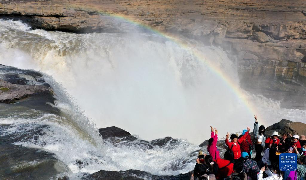 隨著氣溫不斷回升,黃河壺口瀑布水流量明顯增大,在陽光的照射下,飛瀑與彩虹相映成趣,把一幅動靜結合的春天畫卷展現在游客眼前。