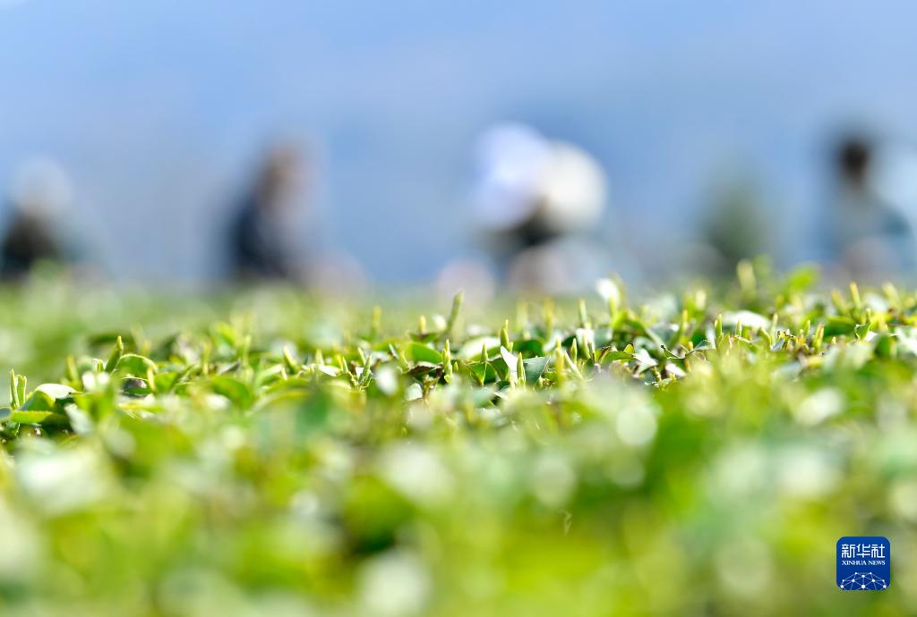 春暖茶山,春茶萌芽,茶農們采摘茶葉嫩芽,供應市場。