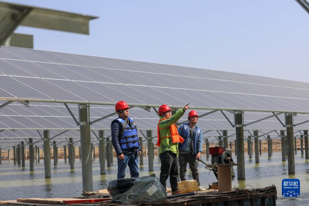 3月8日,工作人員在巡視水上光伏電板運行情況。