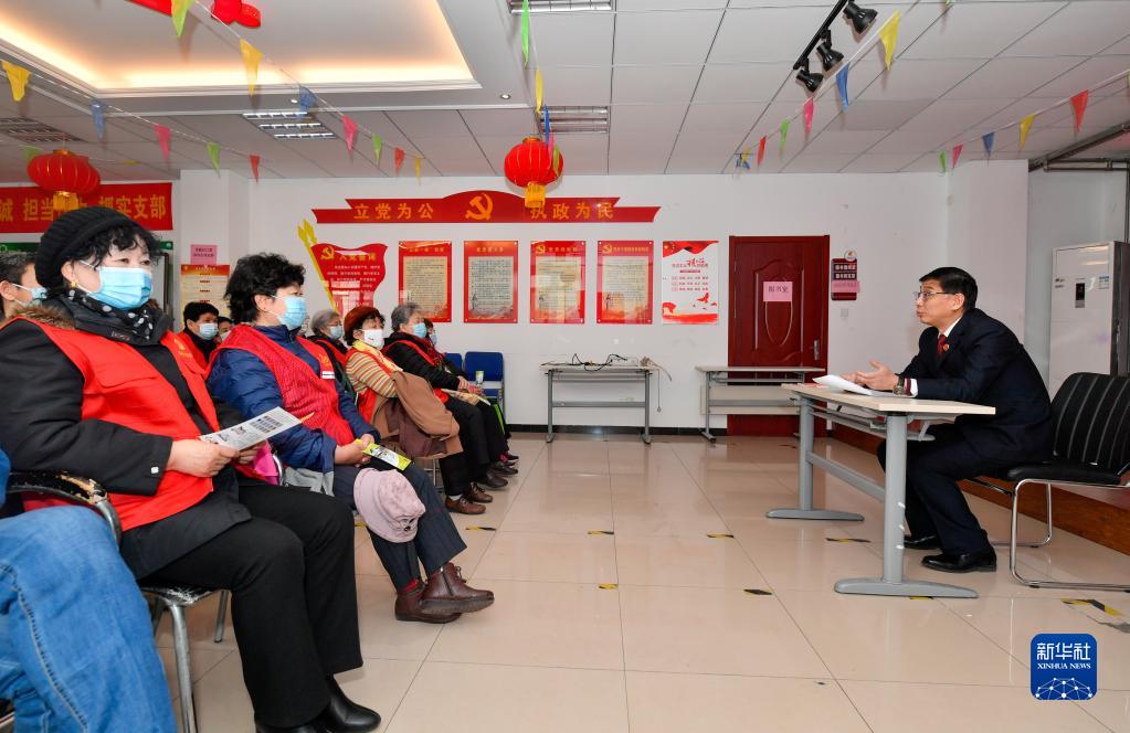 3月8日,在天津市南開區向陽路街道大園新居社區居委會,天津市南開區人民檢察院檢察官刁智(右)向居民宣講《中華人民共和國反有組織犯罪法》。
