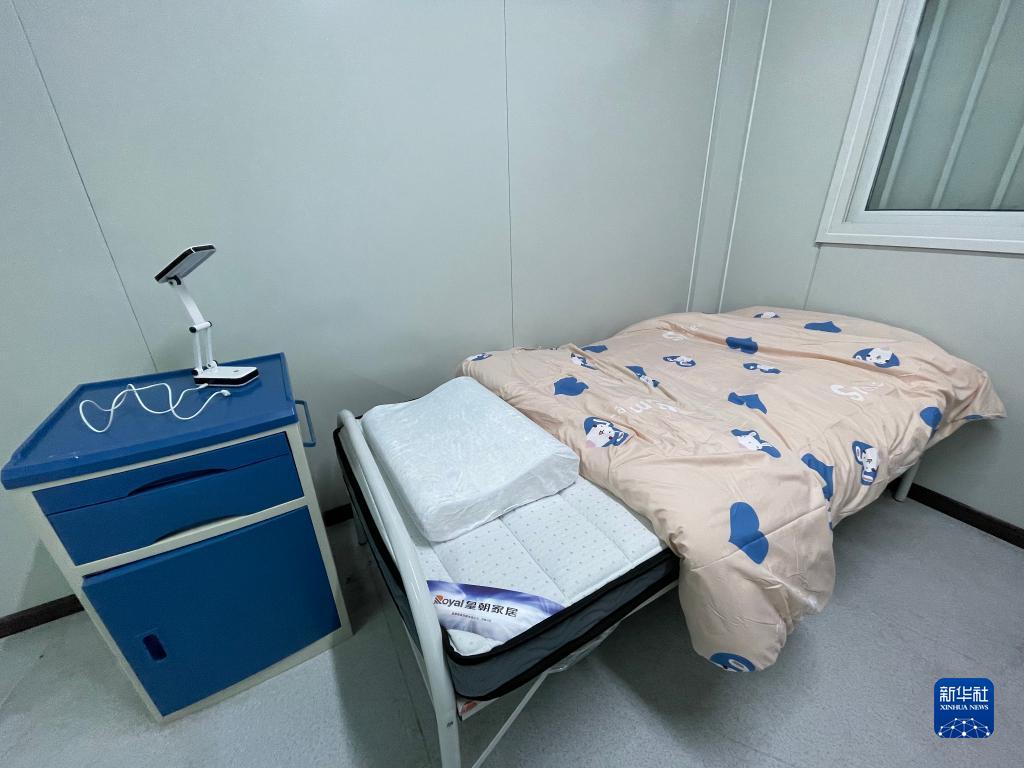 這是3月9日拍攝的方艙醫院房間(手機照片)。每位入住者配有一床薄羽絨被及被罩、一個乳膠枕頭及枕套、一個床頭柜及充電式折疊小臺燈。