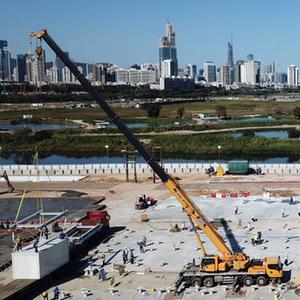 3月9日,中央援建香港應急醫院項目首個集成式箱體吊裝施工現場(無人機照片)。