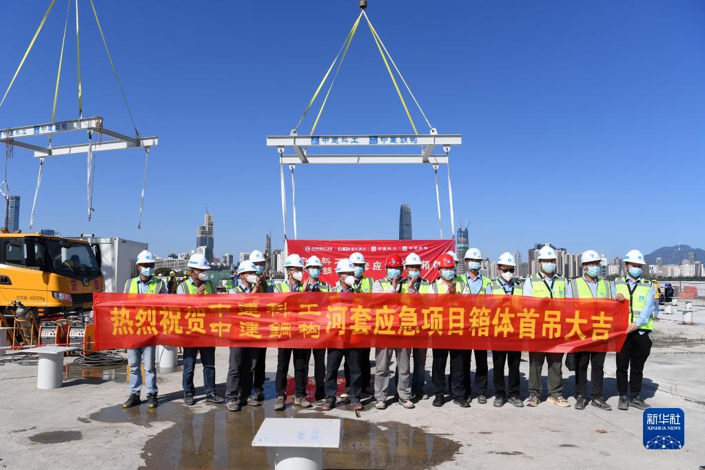 3月9日,中央援建香港應急醫院項目首個集成式箱體吊裝施工現場。
