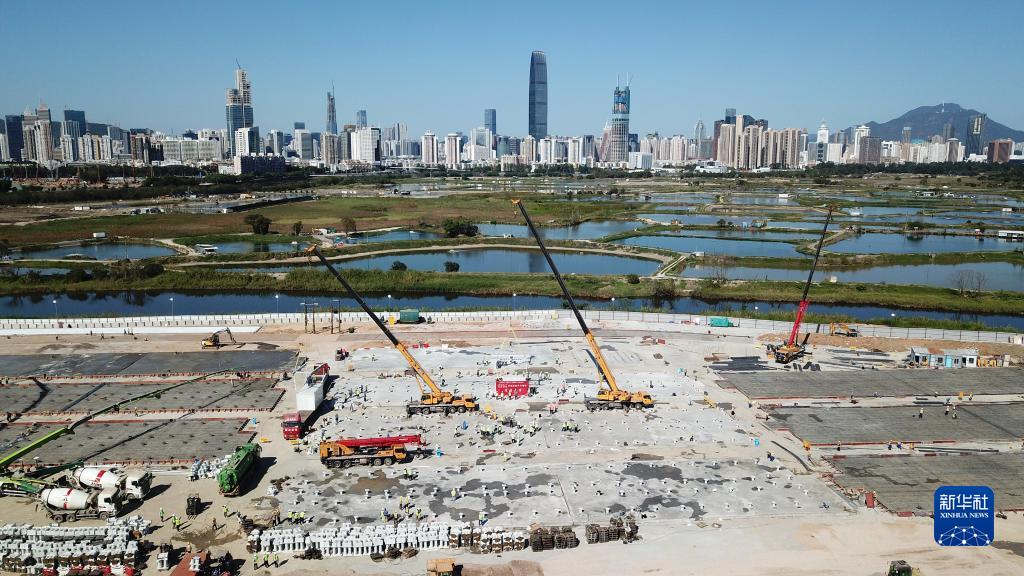 這是3月9日拍攝的中央援建香港應急醫院項目首個集成式箱體吊裝施工現場(無人機照片)。