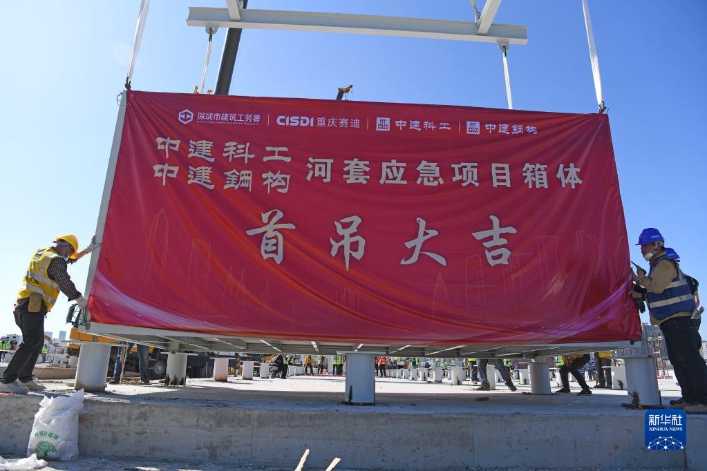 3月9日,中央援建香港應急醫院項目首個集成式箱體吊裝施工現場。