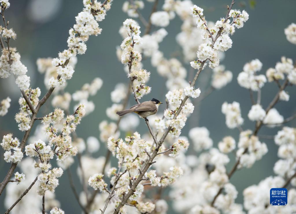 3月10日,在貴州省貴陽市小車河城市濕地公園,一只小鳥在花間停留。