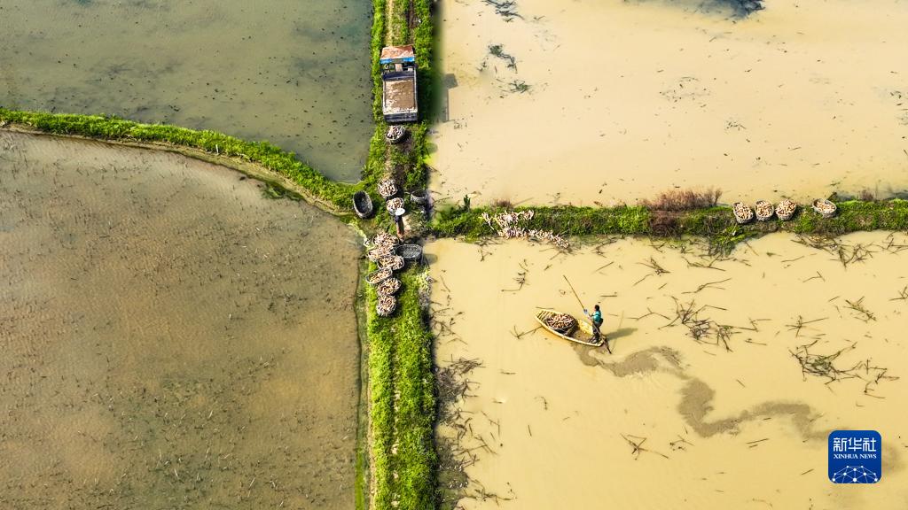 3月13日,在湖南省衡陽市常寧市板橋鎮板橋村,藕農在藕田里轉運剛采收的蓮藕(無人機照片)。