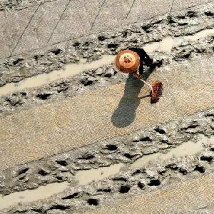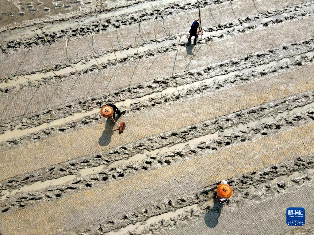 3月13日,在湖南省婁底市雙峰縣井字鎮花橋村,農民在秧田勞作(無人機拍攝)。