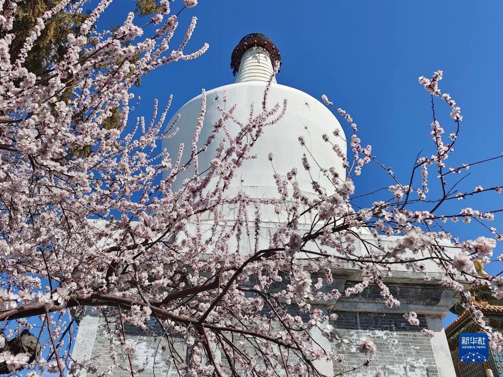 3月14日,盛開的山桃花掩映著北京北海公園白塔。