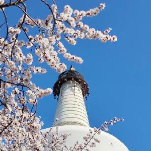 春暖大地,北京北海公園白塔旁的山桃花盛開,吸引不少游客前來欣賞。
