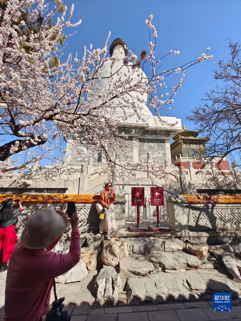 春暖大地,北京北海公園白塔旁的山桃花盛開,吸引不少游客前來欣賞。