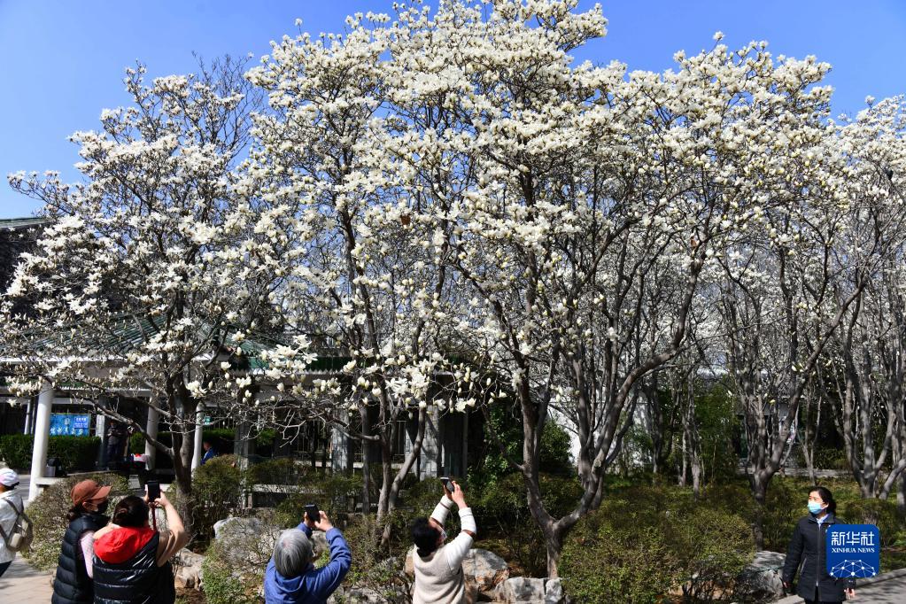 3月14日,游客在山東省濟南市百花公園拍攝盛開的玉蘭花。