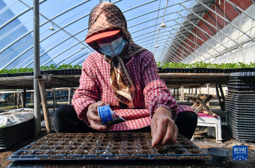 3月14日,在天津市寧河區苗莊鎮一家種苗培育基地,農民在穴盤里播種育苗。