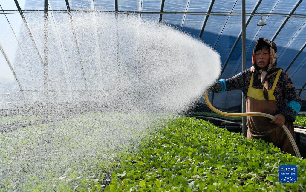 3月14日,在天津市寧河區苗莊鎮一家種苗培育基地,農民在給種苗澆水。