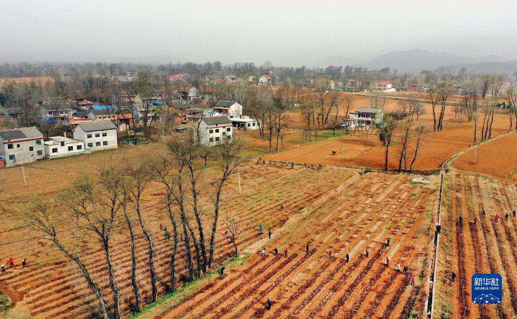 3月14日,洛南縣永豐鎮席塬村村民在栽種樹苗(無人機照片)。