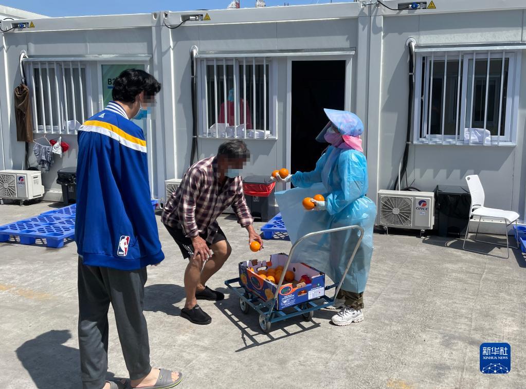 方艙醫院的工作人員給隔離人員配發水果(3月12日攝,手機照片)。