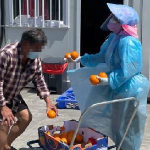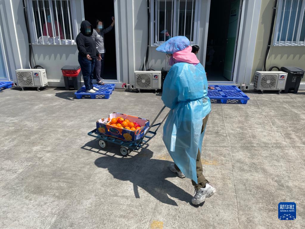 方艙醫院的工作人員給隔離人員配發水果(3月12日攝,手機照片)。