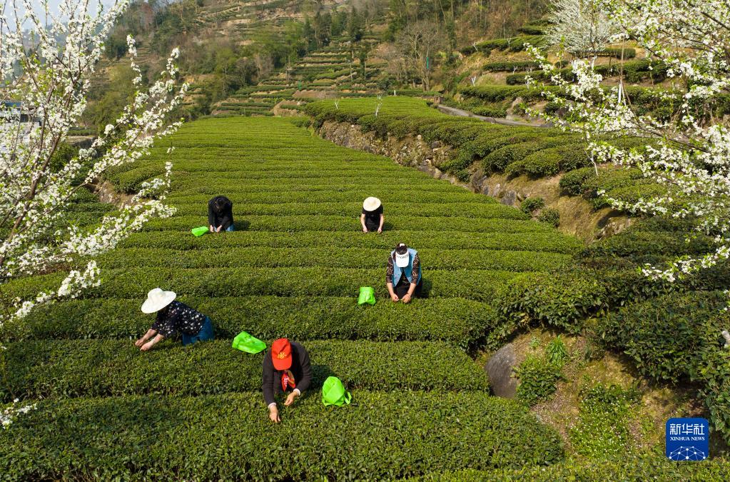 3月15日,湖北省宜昌市秭歸縣茅坪鎮中壩子村村民在茶園采茶(無人機照片)。