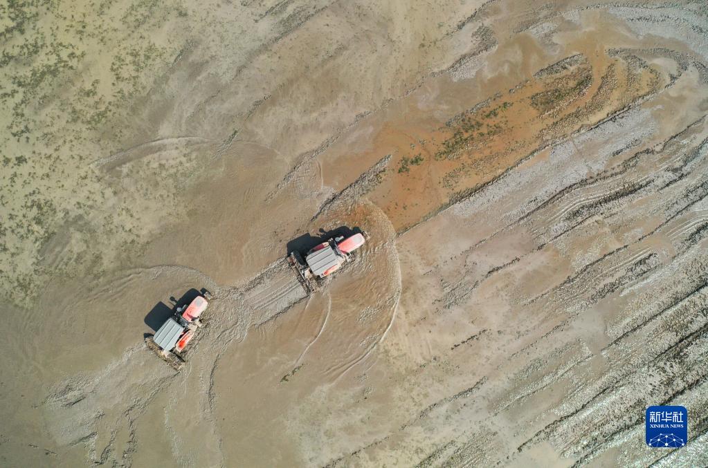 3月15日,農機手駕駛農機在四川省廣安市廣安區大安鎮福城村翻耕稻田(無人機照片)。