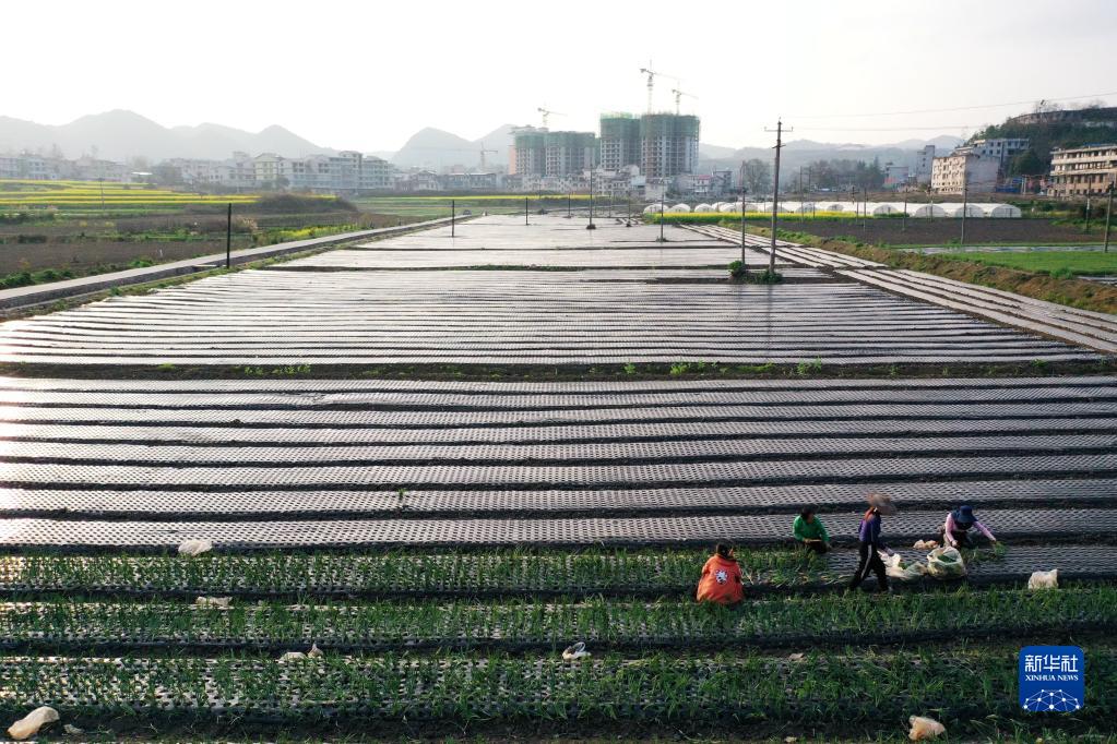 3月15日,在貴州省黔南布依族苗族自治州福泉市龍昌鎮,村民在田間栽種香蔥(無人機照片)。