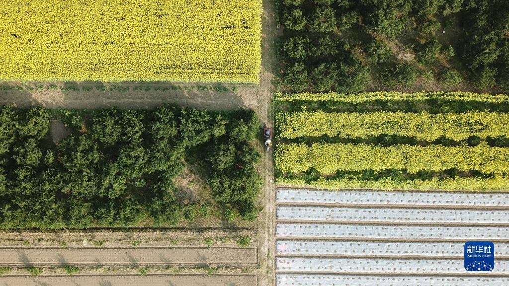 在常德市石門縣葉家坪村,葉金娥騎著三輪車在田間穿行(3月15日攝,無人機照片)。