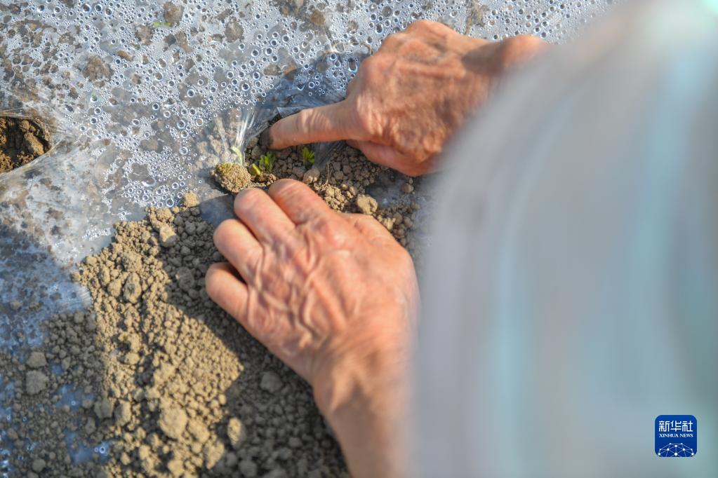在常德市石門縣葉家坪村,葉金娥在查看農作物生長情況(3月15日攝)。