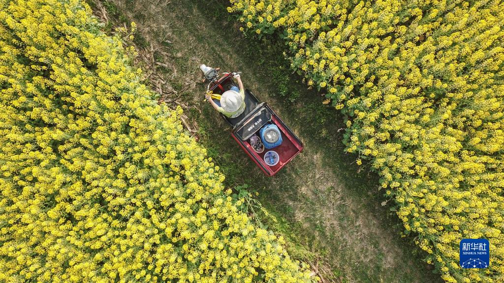 在常德市石門縣葉家坪村,葉金娥騎著三輪車在油菜花叢中穿行(3月15日攝,無人機照片)。