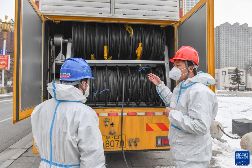 3月18日,國網吉林供電公司的黨員林穆(右)與前來支援的國網佳木斯供電公司的黨員關力一起為醫療單位設計保電方案。