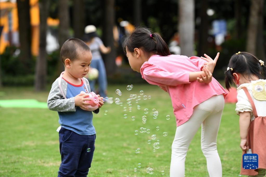 3月20日,小朋友在廣西南寧市金花茶公園玩耍。