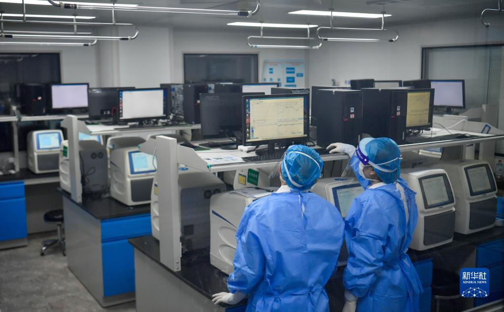 3月19日,在天津市河北區城市核酸檢測基地內,工作人員在擴增分析區分析核酸樣本數據。