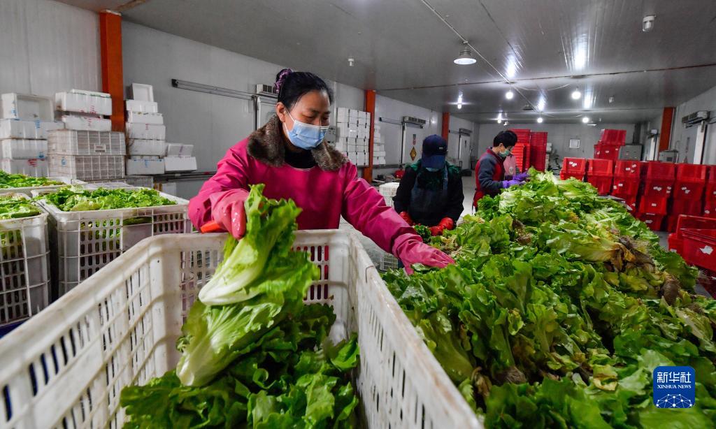 3月21日,在誠好(天津)供應鏈管理有限公司車間,工人將水培蔬菜去除根系后裝箱。新華社記者 孫凡越 攝