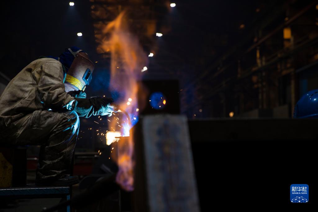 3月23日,工人在哈電集團哈爾濱電機廠有限責任公司生產車間內進行焊接作業。