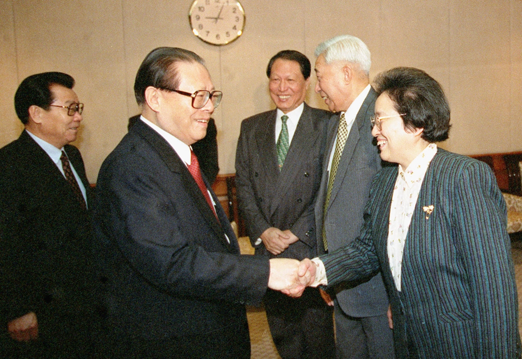 1997年1月1日,江澤民同志在北京會見民革中央新任主席何魯麗同志。新華社記者 劉建生 攝