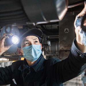 3月23日,武漢地鐵三金潭車輛段8號線月修庫員工在檢查地鐵車底部件。