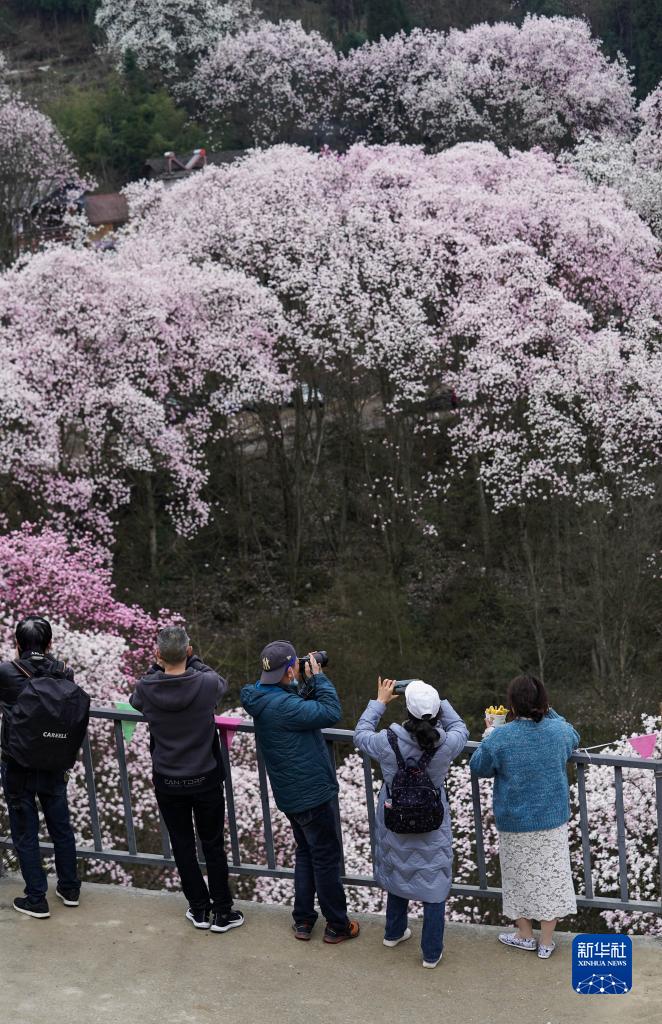 目前正是四川省江油市大康鎮戴天山村的辛夷花盛開的季節。這里的辛夷花在群山環抱中綿延數十里,呈現出一派世外桃源的景象,吸引游人前來踏青賞花。當地的農家樂旅游接待、土特產銷售等“花經濟”,促進了村民們增產增收。