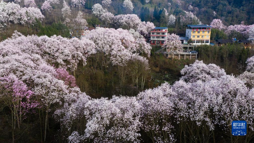 目前正是四川省江油市大康鎮戴天山村的辛夷花盛開的季節。這里的辛夷花在群山環抱中綿延數十里,呈現出一派世外桃源的景象,吸引游人前來踏青賞花。當地的農家樂旅游接待、土特產銷售等“花經濟”,促進了村民們增產增收。