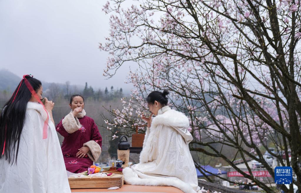 江油市大康鎮戴天山村辛夷花盛開,幾名茶藝愛好者在花林下品茶(3月23日攝)。