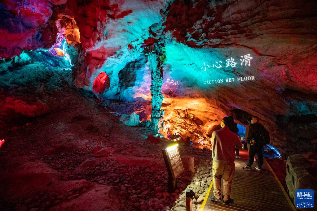 3月22日,在重慶市黔江區濯水鎮蒲花暗河景區,游客在赤穴溶洞內參觀游玩。