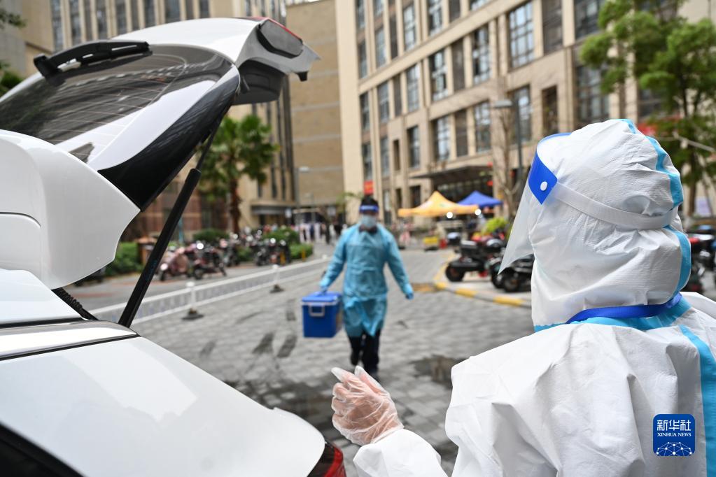 3月24日,在泉州市豐澤區星光耀廣場,出租車司機陳麗珍(右)在等待核酸檢測樣本裝車。