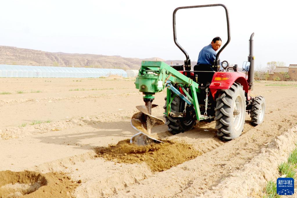 3月26日,甘肅省平涼市靜寧縣城川鎮大寨村村民用拖拉機打育樹坑,準備新植果樹。