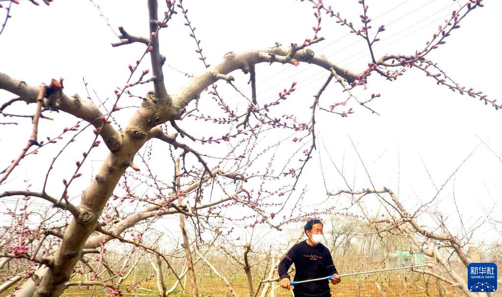 3月26日,山東省聊城市茌平區賈寨鎮前付村的農民在田間給桃樹噴灑防治病蟲害的藥物(無人機照片)。