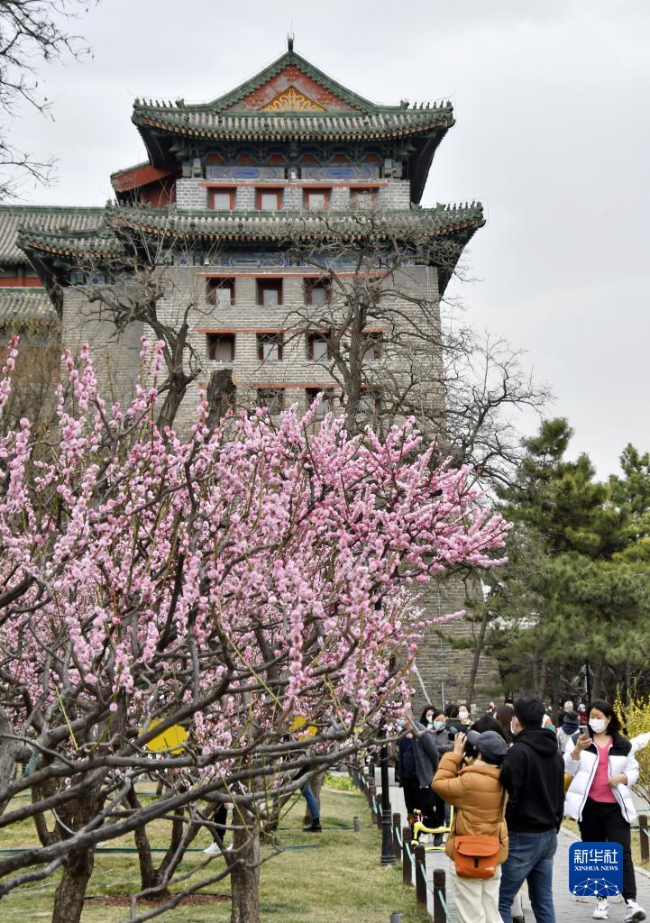 近期,北京市明城墻遺址公園內桃花盛開,吸引大批市民前來賞花踏青。