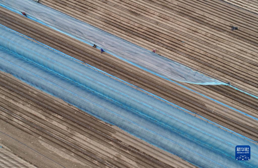 3月30日,在河北省趙縣韓村鎮,農民在搭建姜棚(無人機照片)。
