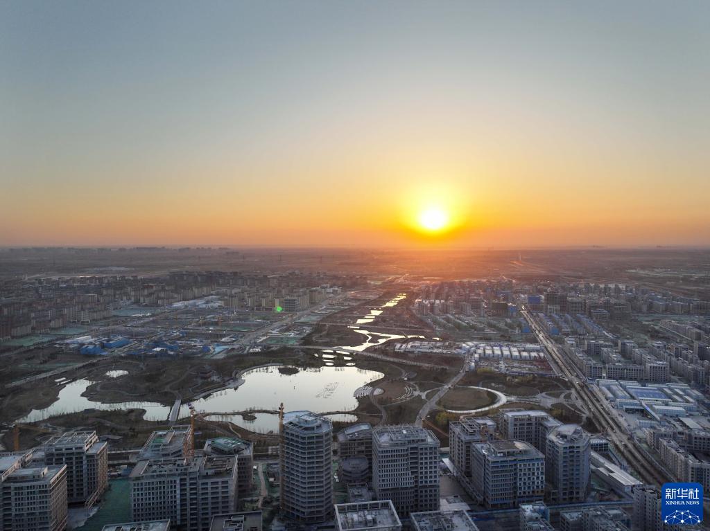 4月1日在雄安新區拍攝的日出(無人機照片)。