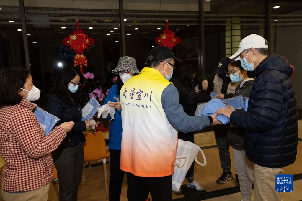 3月31日晚,在上海市中遠兩灣城小區,社區志愿者為第二天的核酸檢測做準備。