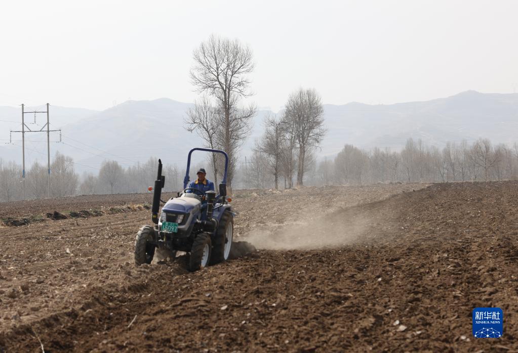 在青海省西寧市大通回族土族自治縣景陽鎮山城村,村民姜有盛駕駛拖拉機翻整土地(3月24日攝)。